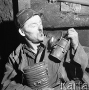 Kwiecień 1958, Wojkowice Komorne, woj. Katowice, Polska. Kopalnia Węgla Kamiennego "Jowisz", górnik zapala papierosa od lampy. Fot. Romuald Broniarek, zbiory Ośrodka KARTA
