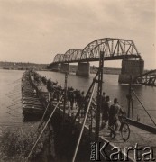 Lata 20., Polska. Żołnierze piechoty podczas przeprawy przez rzekę po kładce polowej. Fot. NN, Instytut Polski i Muzeum im. gen. Sikorskiego w Londynie