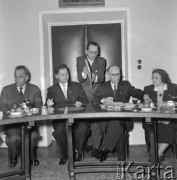 Styczeń 1961, Warszawa, Polska. Władysław Gomułka przemawia podczas przyjęcia w ambasadzie radzieckiej. Za stołem stoją m.in. Zenon Kliszko, Aleksander Zawadzki i Józef Cyrankiewicz. Fot. Romuald Broniarek/KARTA