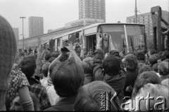 5-6.12.1981, Warszawa, Polska. II Walne Zebranie Delegatów NSZZ "Solidarność" Regionu Mazowsze w auli Politechniki Warszawskiej. Na zdjęciu ludzie przed wejściem do Gmachu Głównego Politechniki Warszawskiej. Na budynku powieszono transparenty strajku studentów w Łodzi. Fot. NN, zbiory Ośrodka KARTA, zespół Fotoreporterów NSZZ "Solidarność" Regionu Mazowsze