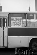 Lata 80., Częstochowa, Polska. Pielgrzymka Ludzi Pracy na Jasną Górę. Transparent pielgrzymów z Mazowsza o treści: "Bo lepiej byśmy stojąc, umierali, niż mamy klęcząc na kolanach żyć". Fot. Mieczysław Michalak, zbiory Ośrodka KARTA