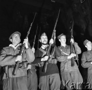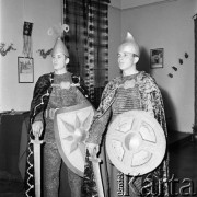 lata 60-te, Kozłowa Góra k/Piekar Śląskich, Polska. Występ Zespołu Pieśni i Tańca ZMW Kozłowa Góra, dwaj chłopcy w kostiumach rycerzy - w kolczugach, hełmach, z tarczami i mieczami - podczas recytacji. Fot. Kazimierz Seko, zbiory Ośrodka KARTA.