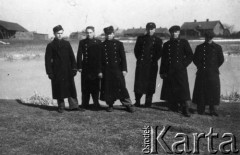 Wiosna 1944, Wierzbałowo (Virbalis), Litwa. Chłopcy wywiezieni w kwietniu 1943 z okolic Wilna do pracy przymusowej na dużej przygranicznej stacji kolejowej w Kybartach (Kybartai). Stacja nosiła nazwę starszej od miasteczka Kybarty wsi Wierzbałowo odległej o 5 km. Stoją od lewej: Michał Janowicz, Wacław Zdanowicz, Stanisław Bielawski, NN "Malarz" (Polak z Kowna, malował numery na parowozach), Adamowicz, NN "Czubczyk" (śpiewał piosenkę o "czubczyku kuczerawym"). W tle domy miasteczka Kybarty. Fot. Czesław Zapolski, udostępnił Michał Janowski, zbiory Ośrodka KARTA