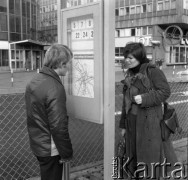 10.11.1977, Warszawa, Polska. Ulica Marszałkowska, przystanek tramwajowy, pasażerowie przed rozkładem jazdy, w tle Rotunda. Fot. Jarosław Tarań, zbiory Ośrodka KARTA [77-163]