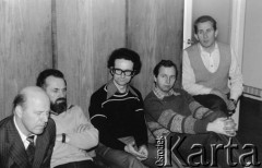 Listopad 1979, Warszawa, Polska. Spotkanie Rady Sygnatariuszy Ruchu Obrony Praw Człowieka i Obywatela w mieszkaniu Kazimierza Janusza; przy oknie siedzi Wojciech Ziembiński, obok Adam Wojciechowski i Bogumił Studziński, tyłem siedzą: Kazimierz Janusz, Kazimierz Ćwitoń i Andrzej Czuma. Fot. Janusz Krzyżewski, zbiory Ośrodka KARTA