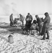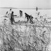 9.01.1969, Giżycko, Polska Jezioro Dobskie koło Giżycka, połowy pod lodem, rybacy z sieciami. Fot. Jarosław Tarań, zbiory Ośrodka KARTA [69-340]