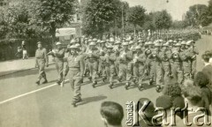 1942-1943, Wielka Brytania. Defilada czołgów Mk III Valentine obsługiwanych przez żołnierzy 1 Dywizji Pancernej gen. Stanisława Maczka. Na trybunie honorowej stoją prezydent Jugosławii Piotr II Karadziordziević, prezydent RP na uchodźstwie Władysław Raczkiewicz oraz Naczelny Wódz gen. Władysław Sikorski. Fot. NN, Studium Polski Podziemnej w Londynie