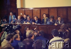 12.05.1981, Warszawa, Polska. Rejestracja NSZZ "Solidarności" Rolników Indywidualnych. W budynku Sądu Wojewódzkiego. Jan Kułaj, przewodniczący "Solidarności" RI wśród dziennikarzy i działaczy związku. Fot. NN, zbiory Ośrodka KARTA, udostępnił Edward Lipiec