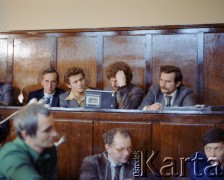 22.05.1995, Warszawa, Polska. Proces przed Sądem Wojewódzkim trzech byłych milicjantów, oskarżonych o śmiertelne pobicie Grzegorza Przemyka w maju 1983. Na zdjęciu z tyłu oskarżeni, od lewej: Arkadiusz Denkiewicz, Ireneusz Kościuk, Kazimierz Otłowski. Na pierwszym planie obrońcy, m.in. mecenas Stanisław Szczuka (drugi od lewej). Fot. Kacper M. Krajewski, zbiory Ośrodka KARTA