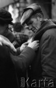 10.01.1981, Warszawa, Polska. Złożenie wniosku o rejestrację NSZZ "Solidarność" Rolników Indywidualnych, n/z Lech Wałęsa w góralskim kapeluszu, niesiony na ramionach. Fot. NN, kolekcja NZS SGGW, zbiory Fundacji Ośrodka KARTA, udostępnili Ryszard Marszałek i Jerzy Boruc