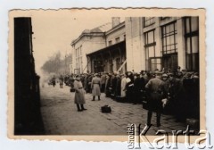 Listopad 1941 - sierpień 1943, Zawiercie, Górny Śląsk, Polska. Żydowskie getto. Żydzi z walizkami zgrupowani przed budynkiem dworca PKP, pilnowani przez policjantów z Schutzpolizei. Fot. NN, zbiory Ośrodka KARTA, przekazał Simcha Nornberg