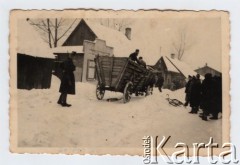 Listopad 1941 - sierpień 1943, Zawiercie, Górny Śląsk, Polska. Żydowskie getto. Wóz z dwoma Żydami, kilkunastu Żydów zgromadzonych przed wozem. Na pierwszym planie funkcjonariusz Schutzpolizei z bronią na ramieniu. Fot. NN, zbiory Ośrodka KARTA, przekazał Simcha Nornberg