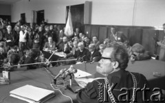12.05.1981, Warszawa, Polska Rozprawa sądowa w sprawie rejestracji NSZZ "Solidarność" Rolników Indywidualnych. Sędzia Zdzisław Kościelniak czyta orzeczenie. Fot. Lech Ścibor-Rylski, zbiory Ośrodka KARTA/Independent Polish Agency (IPA) przekazał Józef Lebenbaum