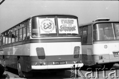 wrzesień-październik 1981, Gdańsk, Polska. Obrady I Krajowego Zjazdu Delegatów NSZZ „Solidarność”. Autobus delegatów na Zjazd ze Śląska Opolskiego, na szybie przyklejono plakaty. Fot. Maciej Czarnocki, zbiory Ośrodka KARTA.