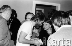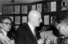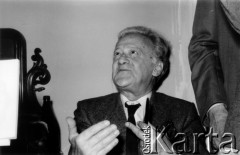 Lata 80., Warszawa, Polska. Spotkanie z Lechem Wałęsą w Klubie Inteligencji Katolickiej, w głębi Henryk Mażul. Fot. Bogdan Łopieński, zbiory Ośrodka KARTA