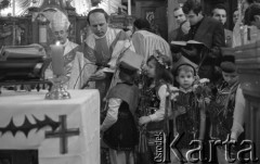 28-29.03.1981, Jarosław, Polska. Msza święta w Kolegiacie Bożego Ciała z udziałem delegatów na I zjazd Niezależnego Samorządnego Związku Rolników Indywidualnych „Solidarność”. Dzieci w strojach ludowych i księża. Fot. NN, zbiory Ośrodka KARTA/Independent Polish Agency (IPA) przekazał Józef Lebenbaum