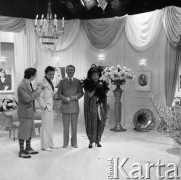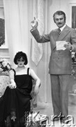 Grudzień 1983, Łódź, Polska. Teatr im. Stefana Jaracza, Łódź. Przedstawienie: "Opiekun Mojej Żony", autor Feydeau Georges. Reżyseria Włodzimierz Nurkowski, scenariusz Jerzy Walden (adaptacja), Mirosław Łebkowski (piosenki), choreografia Janina Niesobska, scenografia Anna Sekuła, muzyka Piotr Hertel. Premiera 10 grudnia 1983. Z lewej Bożena Miller-Małecka. Fot. Witold Górka, zbiory Ośrodka KARTA