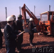 Marzec 1975, Dąbrowa Górnicza, woj. Katowice, Polska. Budowa Huty Katowice, grupa robotników w kaskach i kombinezonach roboczych na placu budowy. Fot. Romuald Broniarek/KARTA