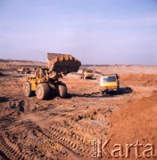 Marzec 1975, Dąbrowa Górnicza, woj. Katowice, Polska. Budowa Huty Katowice, koparka ładująca ziemię na ciężarówkę. Fot. Romuald Broniarek/KARTA