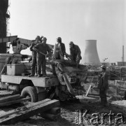 Październik 1975, Dąbrowa Górnicza, woj. Katowice, Polska. Budowa Huty Katowice, wyładowywanie stalowych elementów z przyczepy ciężarówki. Fot. Romuald Broniarek/KARTA