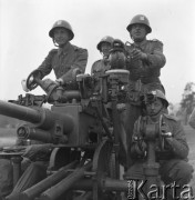 Maj 1958, Wesoła k/Warszawy, Polska. Ćwiczenia żołnierzy 1 Warszawskiej Dywizji Zmechanizowanej, obsługa działa na stanowisku. Fot. Romuald Broniarek, zbiory Ośrodka KARTA