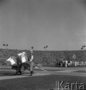Wrzesień 1958, Warszawa, Polska. Centralne dożynki na Stadionie Dziesięciolecia, występ zespołu ludowego. Fot. Romuald Broniarek, zbiory Ośrodka KARTA