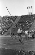 Maj 1959, Warszawa, Polska. Mecz Lekkoatletyczny Polska - Związek Radziecki na Stadionie Dziesięciolecia, zawodnik rzucający oszczepem. Fot. Romuald Broniarek/KARTA