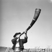 Wrzesień 1959, Warszawa, Polska. Próba przed dożynkami na Stadionie Dziesięciolecia, mężczyzna gra na ligawce. Fot. Romuald Broniarek/KARTA