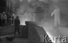 Październik 1968, Warszawa, Polska. Huta Warszawa, robotnicy w hali produkcyjnej - spust surówki do form. Fot. Romuald Broniarek/KARTA