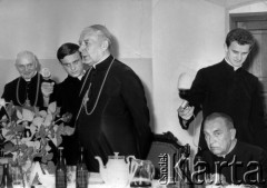 Grudzień 1968, Warszawa, Polska. Pogrzeb biskupa warszawskiego Zygmunta Choromańskiego, zmarłego 26.12.1968. Składanie trumny do grobu. Na dalszym planie modlący się Prymas Polski, metropolita warszawski kardynał Stefan Wyszyński. Zygmunt Choromański był w latach 1946-1968 biskupem pomocniczym warszawskim i sekretarzem generalnym Konferencji Episkopatu Polski. Fot. Edward Grochowicz, zbiory Ośrodka KARTA.