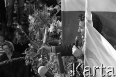 Sierpień 1988, Gdańsk, Polska. Regionalna Komisja Koordynacyjna NSZZ „Solidarność” wezwała do rozpoczęcia strajku w całym Regionie Gdańskim. "Stanęły" m.in. stocznie Gdańska im. Lenina, Remontowa, Wisła i Radunia. Strajkujący z figurką Matki Boskiej, krzyżem, godłem Polskim i obrazem Jana Pawła II. Fot. Stanisław Składanowski, zbiory Ośrodka KARTA