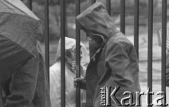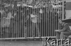 Sierpień 1980, Gdańsk, Polska. Strajk okupacyjny w Stoczni Gdańskiej im. Lenina. Widok z okna na zgromadzonych podczas mszy świętej robotników oraz ludzi za bramą stoczni. Fot. Zbigniew Trybek, zbiory Ośrodka KARTA