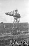 3.10.1980, Gdańsk, Polska. Pracownicy Stoczni Gdańskiej biorą udział w ogólnopolskim, jednogodzinnym strajku ostrzegawczym. Na zdjęciu stoczniowcy siedzą na nabrzeżu, w tle dźwigi i stoczniowcy na kadłubie okrętu. Fot. Zbigniew Trybek, zbiory Ośrodka KARTA