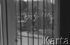 3.10.1980, Gdańsk, Polska. Pracownicy Stoczni Gdańskiej biorą udział w ogólnopolskim, jednogodzinnym strajku ostrzegawczym. Na zdjęciu ludzie przy bramie stoczniowej. Fot. Zbigniew Trybek, zbiory Ośrodka KARTA