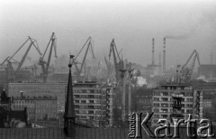 Około 1966, Gdańsk, Polska. Dźwigi w Stoczni Gdańskiej (od 15.04.1967 Stocznia Gdańska im. Lenina). Fot. Edward Grochowicz, zbiory Ośrodka KARTA.