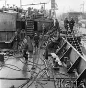 24.01.1971, Szczecin, Polska. Miesiąc po zakończeniu grudniowych strajków 1970 roku, robotnicy Szczecina znów zastrajkowali. Na rozmowy z nimi, do Stoczni im. A. Warskiego, przyjechał I sekretarz KC PZPR Edward Gierek z przedstawicielami rządu. Nz. od lewej Edmund Bałuka (przewodniczący Komitetu Strajkowego), Franciszek Kaim (minister przemysłu ciężkiego), Tadeusz Cenkier (dyrektor stoczni). Świetlica Stoczni Szczecińskiej im. Adolfa Warskiego. Fot. Maciej Jasiecki, zbiory Ośrodka KARTA