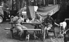Maj 1958, Polska. Poczęstunek dla polskich żołnierzy oraz zawodników radzieckich, uczestników Motorowego Rajdu Przyjaźni - Moskwa-Warszawa-Moskwa. Oranżada i inne napoje na stole. Fot. Romuald Broniarek, zbiory Ośrodka KARTA