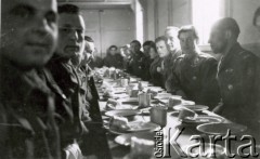 1931-1937, Brześć nad Bugiem, woj. poleskie, Polska. Grupa podoficerów 4 Batalionu Pancernego Wojska Polskiego (do 1935 r. 4 Dywizjonu Pancernego) prawdopodobnie uczestniczy w kolacji wydanej z okazji święta batalionowego. Fot. NN, kolekcja Jana Gozdawy-Gołębiowskiego, zbiory Ośrodka KARTA