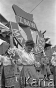 31.07.1955 - 4.08.1955, Warszawa, Polska. V Światowy Festiwal Młodzieży i Studentów o Pokój i Przyjaźń. Taniec ludowy na ulicy Marszałkowskiej. Fot. Irena Jarosińska, zbiory Ośrodka KARTA