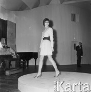 26.02.1968, Warszawa, Polska. Pokaz setnej kolekcji firmy CORA zaprojektowanej przez Jadwigę Grabowską. Modelka w krótkiej sukience w kolorowe grochy, w tle akompaniator przy fortepianie. Fot. Jarosław Tarań, zbiory Ośrodka KARTA