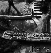 1968, Polska. Wystawa prac ceramicznych Leszka Nowosielskiego, instalacja w ogrodzie. Dziewczyna niosąca tacę z kieliszkami wina. Fot. Jarosław Tarań, zbiory Ośrodka KARTA
