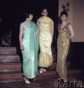 9.02.1979, Warszawa, Polska. Pokaz mody. Prezentacja kolekcji ubrań "Cepelii" - modelki ubrane we wzorzyste sukienki inspirowane strojami ludowymi Fot. Jarosław Tarań, zbiory Ośrodka KARTA [79-10]