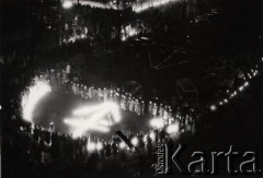 03.11.1984, Warszawa, Polska. Pogrzeb zamordowanego księdza Jerzego Popiełuszki. Został pochowany na terenie kościoła parafialnego św. Stanisława Kostki w Warszawie na Żoliborzu. Na zdjęciu uczestnicy palą świece. Fot. NN, zbiory Ośrodka KARTA, przekazała Elżbieta Oryłowska