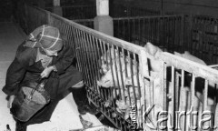 1941, Pfäffikon, Szwajcaria. Żołnierze 6. Kresowego Pułku Strzelców Pieszych podczas dokarmiania świń w zagrodzie obozowej. Fot. NN, zbiory Ośrodka KARTA, album przekazała Wanda Klenczon
