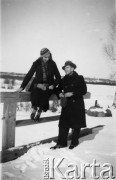 Ok.1933, Rzeczpospolita Polska. Koleżanki Larysy Zajączkowskiej z klasy z Gimnazjum Żeńskiego Zofii Pętkowskiej i Wiktorii Macińskiej w Łodzi pozują do zdjęcia siedząc na drabinie. Fot. NN, kolekcja Larysy Zajączkowskiej-Mitznerowej, zbiory Ośrodka KARTA
