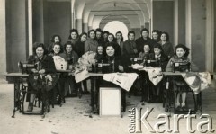 Lata 30., Dicomano, Włochy. Silvia Valli (w środku przy maszynie) na kursie szycia. Silvia w dniu zakończenia II wojny światowej wyszła za mąż za Stefana Szymulę, polskiego żołnierza, który stacjonował w jej rodzinnym miasteczku Dicomano (Włochy). Po wojnie wyjechali do Argentyny. Fot. NN, zbiory Silvii Szymuli, reprodukcje cyfrowe w Bibliotece Polskiej im. Ignacego Domeyki w Buenos Aires (Biblioteca Polaca Ignacio Domeyko) i w Ośrodku KARTA w Warszawie