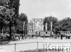 18.07.1943, Lwów, dystrykt Galicja, Generalna Gubernia. Uroczysta odprawa ochotników do 14 Dywizji Strzeleckiej SS "Galizien", za tramwajem widać godło dywizji: lwa na tle błękitnego ryngrafu i trzy złote korony ułożone w kształcie trójkąta; w głębi gmach Teatru Wielkiego. Fot. NN, zbiory Ośrodka KARTA, udostępnił Stanisław Blichiewicz