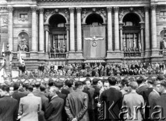 18.07.1943, Lwów, dystrykt Galicja, Generalna Gubernia. Trybuna przed gmachem Teatru Wielkiego, uroczysta odprawa ochotników do 14 Dywizji Strzeleckiej SS "Galizien", na mównicy Gubernator Galicji Otto Wächter. Fot. NN, zbiory Ośrodka KARTA, udostępnił Stanisław Blichiewicz