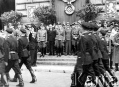 18.07.1943, Lwów, dystrykt Galicja, Generalna Gubernia. Przemarsz ochotników do 14 Dywizji Strzeleckiej SS "Galizien", w środku pomiędzy niemieckimi oficerami stoi Gubernator Galicji Otto Wächter. Fot. NN, zbiory Ośrodka KARTA, udostępnił Stanisław Blichiewicz
