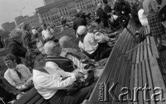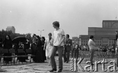9.05.1980, Warszawa, Polska. Obchody Dnia Zwycięstwa na Placu Zwycięstwa (obecnie Plac Józefa Piłsudskiego). W uroczystości bierze udział Orkiestra Reprezentacyjna Wojska Polskiego. W głębi widoczny Teatr Wielki. Fot. Edward Grochowicz, zbiory Ośrodka KARTA